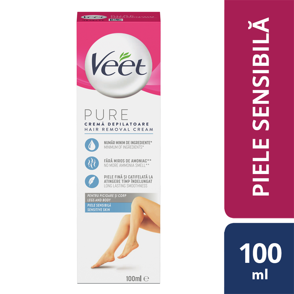 Specificatii si detaliiCrema depilatoare Veet actioneaza aproape de radacina chiar si in cazul firului de par foarte scurt, lasandu-va pielea catifelata timp de pana la o saptamana. Formula pentru piele sensibila este imbogatita cu Aloe Vera si vitamina E, ingrediente recunoscute pentru proprietatile de calmare a pielii.
