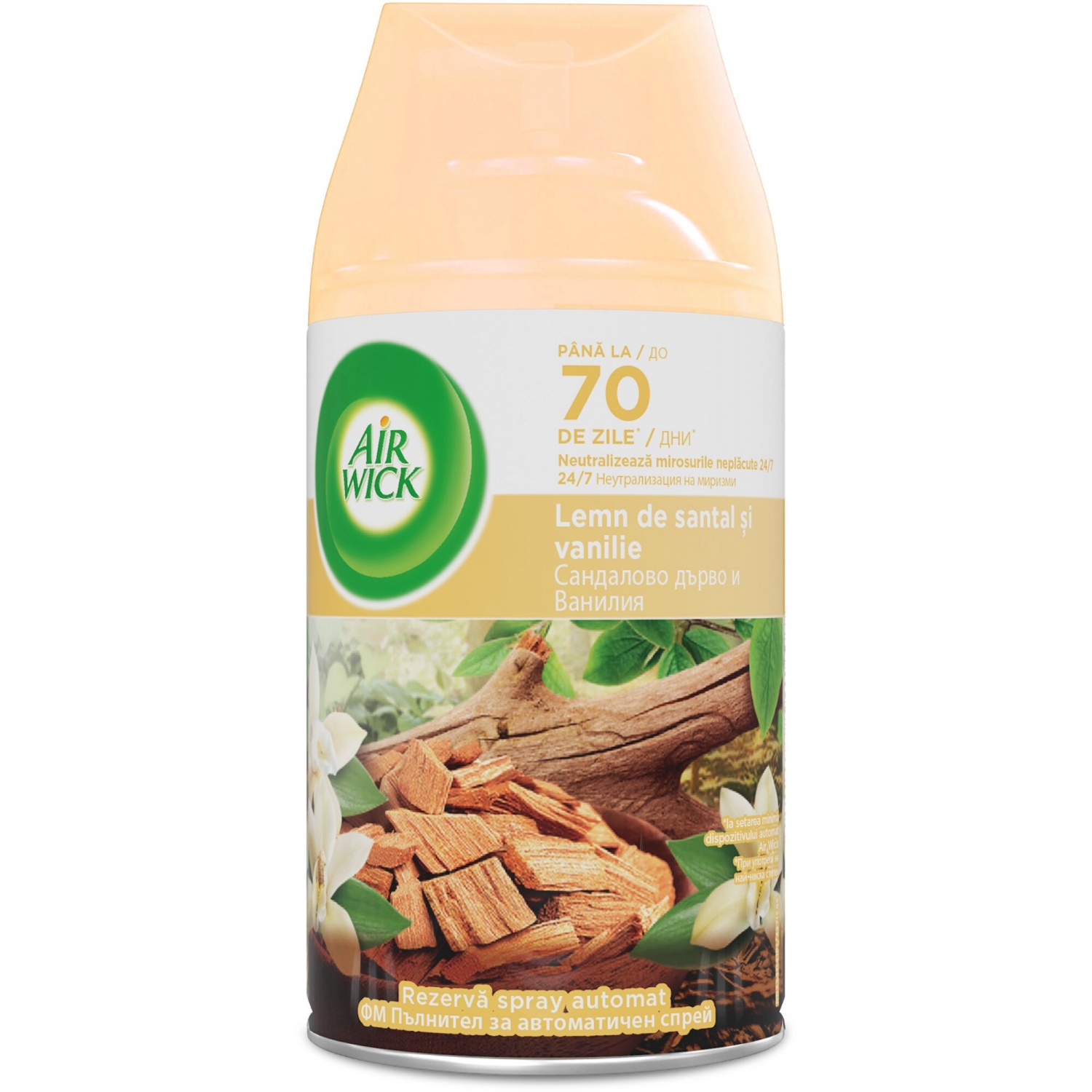 Rezerva spray odorizant automat de camera Air Wick Freshmatic, Lemn de Santal & Vanilie, 250mlDescopera beneficiile produsului: